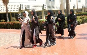 Les femmes s’habillent comme elles le souhaitent, et enfilent traditionnellement une abaya (cape ou robe longue couvrant tout le corps) par-dessus leurs vêtements du quotidien. A l’origine, l’abaya était l’habit traditionnel : sa forme ample et couvrante permettait aux femmes de se protéger de la chaleur du désert. Vêtement modeste qui ne laisse pas deviner les courbes du corps des femmes.une abaya. Elle reste cependant un vêtement présent dans toutes les garde-robes, et se modernise sous l’impulsion des jeunes générations de femmes saoudiennes : couleurs, pierres précieuses et broderies, elle se modernise sans toutefois renier son héritage culturel et religieux.