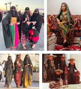 Chaque région d’Arabie saoudite a ses propres traditions vestimentaires, et c’est particulièrement flagrant chez les femmes. Dans la région de Najd (la région centrale, autour de Riyadh), les tissus sont de couleurs vives avec des motifs floraux, et recouverts d’une abaya plus ou moins brodée selon la classe sociale. Dans la région du Hejaz au Nord, les coiffes et vêtements sont ornés de magnifiques broderies dorées. Dans la région orientale (Eastern), les tenues traditionnelles ont été influencées par le commerce avec l’Inde, et les robes se portent un peu façon sari, avec de jolies broderies. Enfin, dans la région de l’Asir au Sud, les robes noires (appelées mujanab) sont brodées avec des fils colorés et/ou des perles, et les femmes portent un foulard jaune orangé avec un large chapeau, ou accrochent un bijou en argent à un foulard jaune orangé qu’elles nouent autour de leur tête.