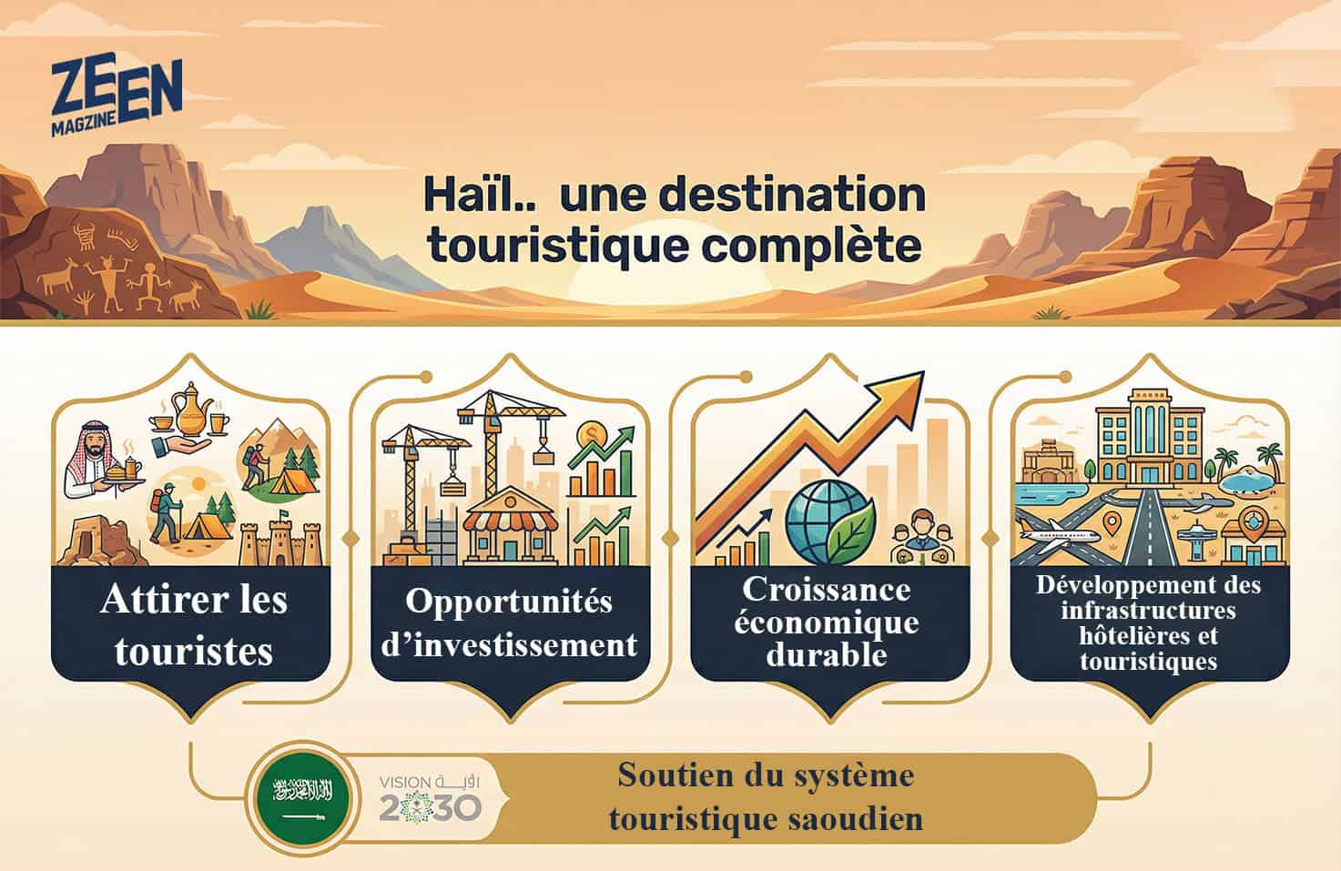 Le système touristique saoudien a renforcé le secteur grâce à la mise en place de programmes d’incitation et de facilitateurs d’investissement pour accélérer la réalisation des projets. Le Fonds de développement touristique fournit des solutions de financement afin d’accélérer le développement des infrastructures touristiques, hôtelières et des expériences uniques. L’Autorité saoudienne du tourisme assure une promotion homogène de la destination, avec un budget de 30 millions de riyals dédié à Haïl dans le cadre de l’hiver saoudien, plus de 300 couvertures médiatiques et la participation de 50 partenaires proposant des offres et forfaits diversifiés pour enrichir l’expérience des visiteurs.